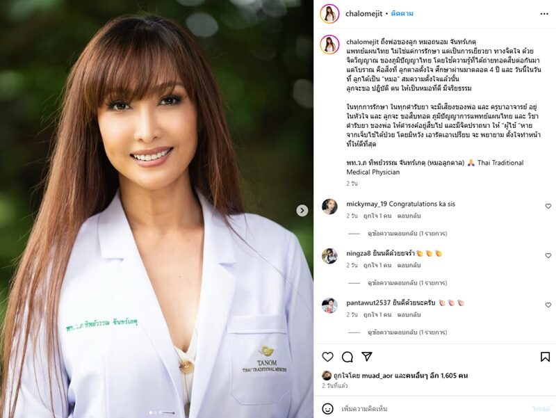 แห่ยินดีกันรัวๆเลยกับอดีตนักแสดงสาวเซ็กซี่ ลูกตาล ชโลมจิต โพสต์ในวันสำคัญของชีวิตที่สานต่อความตั้งใจของคุณพ่อ หมอถนอม เดินตามรอยเป็นคุณหมอตามคุณพ่อได้สำเร็จว่า