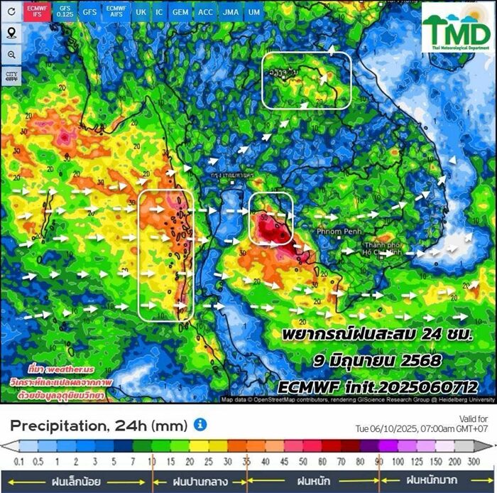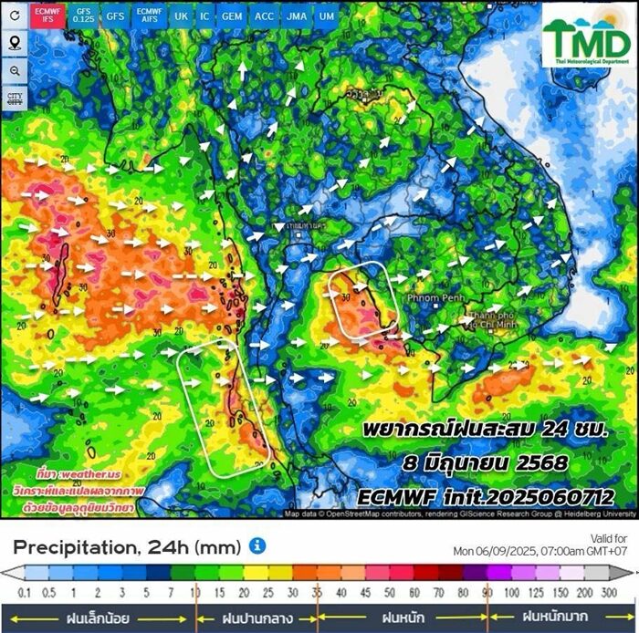 วันที่ 8 มิ.ย.2568 กรมอุตุนิยมวิทยา อัปเดตผลการพยากรณ์ฝนสะสมรายวัน (ทุกๆ 24 ชม.:(นับตั้งแต่ 07.00 น. ถึงเวลา 07.00 น.วันรุ่งขึ้น) และลมที่ระดับ 925hPa (750 ม.)15 วันล่วงหน้า ระหว่าง 8-22 มิ.ย.68 init. 2025060712 จากศูนย์พยากรณ์อากาศระยะกลางยุโรป (ECMWF) วิเคราะห์ตามผลจากแบบจำลองฯ เฉดสีแดงหมายถึงฝนหนัก สีเขียวหมายถึงฝนเล็กน้อย :