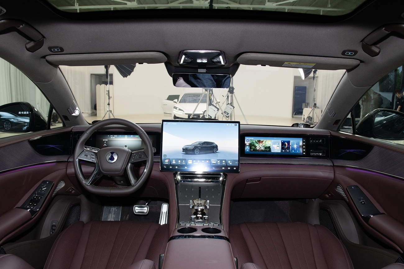 ครั้งแรกกับการเผยภายในสมสง่าลักชัวรีเทียบชั้นรถยุโรปในแบบ Denza 2.0 cockpit designสวยสง่าและลักชัวรีกับแผงคอนโซลหน้าดีไซน์ติดตั้งระบบจอด้วยกันถึง 4 จอประกอบด้วยชุดมาตรวัดดิจิทัลแบบ LCD 12.3 นิ้ว จอสัมผัสเชื่อมต่อระบบความบันเทิงขนาดใหญ่แบบลอยตัว 17.3 นิ้ว มีจอสำหรับฝั่งผู้โดยสารขนาด 10.25 นิ้ว และจอแสดงข้อมูลการขับขี่เหนือคอนโซลหน้าหรือ HUD พร้อมจอแสดงควบคุมระบบปรับอากาศด้านหลัง พวงมาลัยมัลติฟังก์ชัน 4 ก้านปาดล่างแบบ flat-bottomed คอนโซลกลางมีหัวคันเกียร์ไฟฟ้าเป็นคริสตัล ติดตั้งที่ชาร์จสมาร์ตโฟนชาร์จจุใจถึง 2 เครื่อง กำลังชาร์จ 50 W เครื่องเสียงจาก Devialet คาดลำโพง 16 จุดรวมในชุดคอนโซลหน้า ร่วมสร้างความบันเทิงและประสบการณ์ที่น่าจดจำทุกการเดินทาง เสริมด้วยแสงไฟเพื่อสร้างบรรยากาศในห้องโดยสารกว่า 128 เฉดสี
