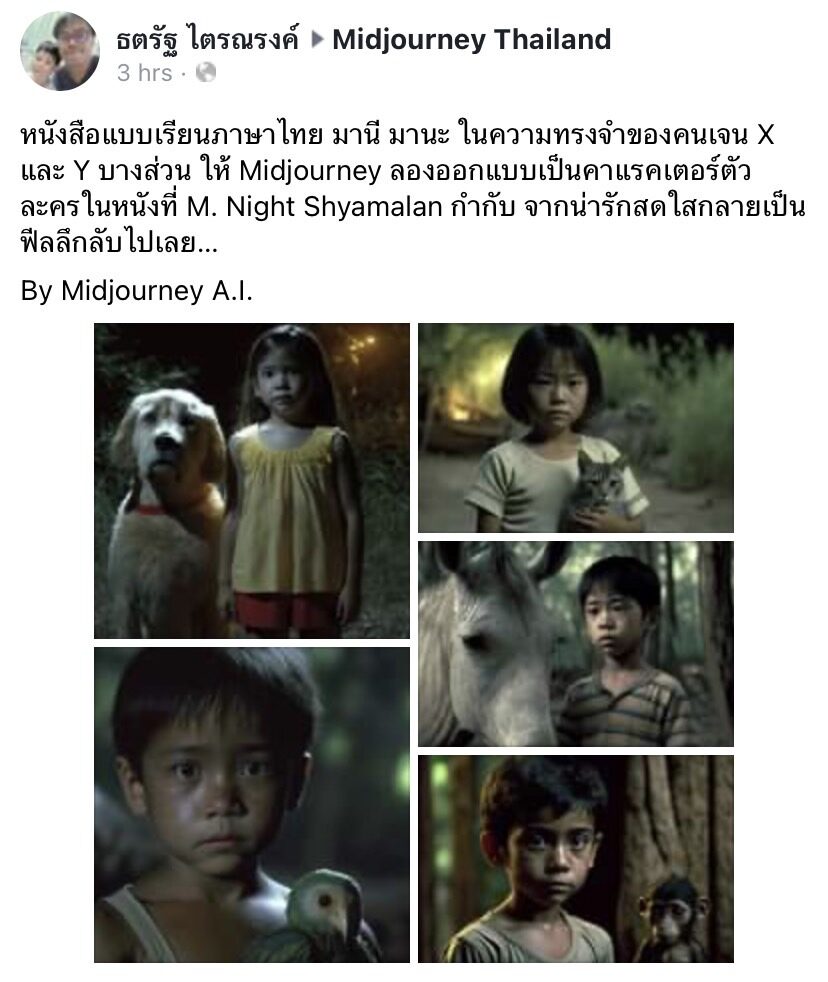 เป็นภาพเสมือนจริงของตัวละครในความทรงจำของใครหลายๆคน มานะ-มานี พร้อมแคปชั่นว่า "หนังสือแบบเรียนภาษาไทย มานี มานะ ในความทรงจำของคนเจน X และ Y บางส่วน ให้ Midjourney ลองออกแบบเป็นคาแรคเตอร์ตัวละครในหนังที่ M. Night Shyamalan กำกับ จากน่ารักสดใสกลายเป็นฟีลลึกลับไปเลย…By Midjourney A.I."