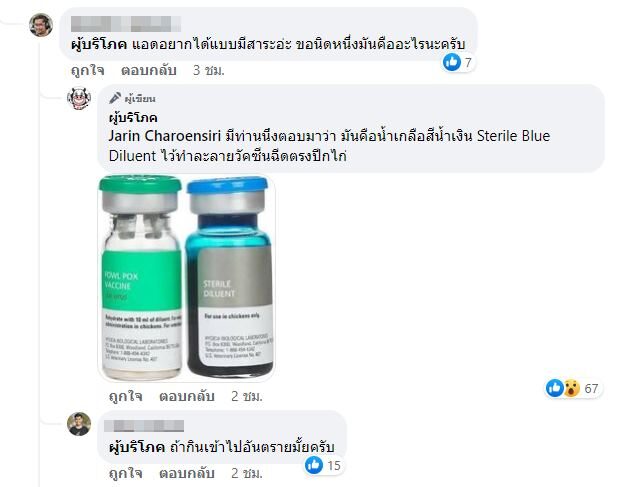 โพสต์ดังกล่าวระบุว่า " ไก่ไม่สุก = สีฟ้า " ก่อนจะมีคอมเมนต์เข้ามาถามจำนวนมากว่า สีฟ้าที่เกิดขึ้นนั้น เกิดขึ้นจากอะไร ซึ่งมีชาวเน็ตรายหนึ่งเข้ามาอธิบายไว้ว่า อาจจะเกิดจากสีน้ำเกลือที่เอาไว้ละลายวัคซีนตรงปีกไก่ ซึ่งยังไม่มีความแน่ชัด ว่า สีฟ้าที่เกิดขึ้นเกิดจากปัจจัยอะไรแน่