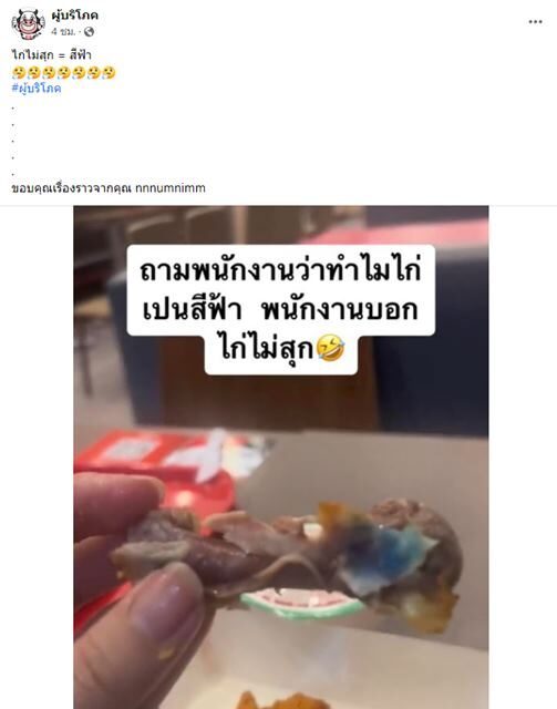 ล่าสุด เพจ ผู้บริโภค ได้โพสต์ภาพจากผู้บริโภครายหนึ่ง ที่ส่งมาให้ดูเพื่อหาคำตอบว่าเกิดอะไรขึ้นกับไก่ชิ้นนี้ โดยภาพพบว่า เป็นสิ้นส่วนคล้ายกระดูกท่อนปีกของไก่ บริเวณเนื้อไก่ กลายเป็นสีฟ้า ซึ่งดูผิดปกติจากเนื้อไก่ทั่วไปที่ควรกินได้ บนภาพเขียนว่า "ถามพนักงานว่าทำไมไก่เป็นสีฟ้า พนักงานบอกไก่ไม่สุก"