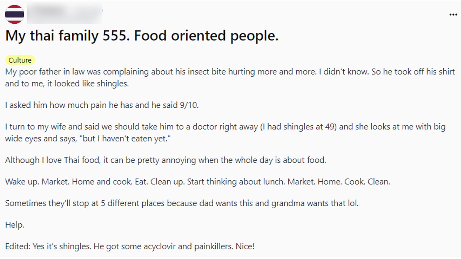 โดยเมื่อวันที่ 11 กันยายน ที่ผ่านมา ผู้ใช้เรดดิทรายหนึ่งได้แบ่งปันว่า พ่อตาของเขาดูเหมือนจะป่วยเป็นอะไรบางอย่าง เอาแต่บ่นว่าเจ็บแผลเรื่อยๆ จนกระทั่งพ่อถอดเสื้อโชว์ให้ดู เขาก็เลยคาดว่าพ่อน่าจะเป็นงูสวัด เพราะเขาเคยเป็นมาก่อน
