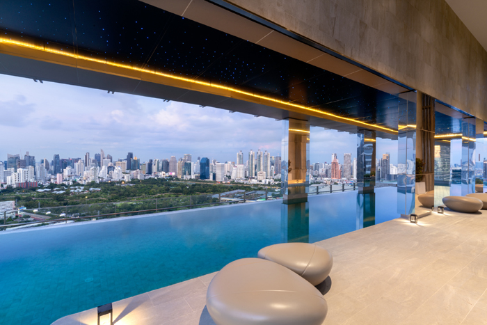 ในส่วนของพื้นที่ส่วนกลาง ได้รับแรงบันดาลใจมาจากยอดมงกุฏ จึงออกแบบให้สิ่งอำนวยความสะดวกต่าง ๆ อยู่บนชั้น 32 ซึ่งสูงที่สุดของตัวโครงการ เพื่อให้ได้พักผ่อนท่ามกลางบรรยากาศวิวสวนและวิวโค้งน้ำบางกระเจ้า แบบ 270 องศา พร้อมสรรพด้วยส่วนกลางที่รองรับไลฟ์สไตล์การพักผ่อนใจกลางเมืองใหญ่ ทั้ง Starry Night Rooftop Riverview พื้นที่ชั้นดาดฟ้าที่สามารถชมวิวสวนสาธารณะได้แบบพาโนรามา, Starry Night Infinite Pool สระว่ายน้ำ ไร้ขอบ มาพร้อม Aqua Sunken Seat สระจากุซซี่เพื่อการพักผ่อนหย่อนใจ รวมไปถึง Crystal Lounge ที่ประกอบด้วยฟังก์ชันรองรับการใช้งานตลอดทั้งวัน ไม่ว่าจะเป็น Crown Bar, All-Day Dining, Fitness Club และ Lounge ทั้งฝั่ง Parkside & Riverside ซึ่งทั้งหมดล้วนถูกดีไซน์ให้เปิดมุมมองด้วยกระจกรอบด้าน ทำให้ได้บรรยากาศของการพักผ่อนที่โปร่งโล่ง และผ่อนคลาย อีกทั้งพื้นที่ส่วนกลางทั้งหมด ได้มีการเลือกสรรเฟอร์นิเจอร์ร่วมกับแบรนด์ชนินทร์ (CHANINTR) ผู้นำเข้าเฟอร์นิเจอร์ระดับไฮเอนด์ชั้นนำของประเทศไทย นอกจากนี้ โครงการฯ ยังมีบริการพิเศษระดับโรงแรม (Concierge Services) ไม่ว่าจะเป็นบริการต้อนรับคอยดูแลอำนวยความสะดวก, บริการขนสัมภาระ คอยช่วยยกกระเป๋าดูแลลูกบ้าน, บริการรถขนของ สำหรับลูกบ้านย้ายเข้า, บริการทำความสะอาด, บริการรับและส่งพัสดุหรืออาหารเดลิเวอรี่จากหน้าคอนโด, บริการพนักงานอำนวยความสะดวก, บริการเรียกรถแท็กซี่ให้กับลูกบ้าน เพื่อให้ตอบโจทย์การใช้ชีวิตสุดเอ็กซ์คลูซีฟได้อย่างแท้จริง” นายสุนทร กล่าว