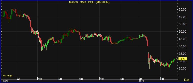 ผู้สื่อข่าวรายงาน วันนี้ (24 ก.พ.68) ราคาหุ้น บริษัท มาสเตอร์ สไตล์ จำกัด (มหาชน) หรือ MASTER ณ เวลา 15:07 น. อยู่ที่ระดับ 31.50 บาท บวก 1.00 บาท หรือ 3.28% สูงสุดที่ระดับ 32.25 บาท ต่ำสุดที่ระดับ 30.25 บาท ด้วยมูลค่าการซื้อขาย 145.91 ล้านบาท