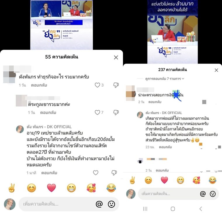 รวมถึงมีคอมเมนต์ไม่สุภาพอย่าง "น่าจะตรวจสอบการเงิน..มัน" ดัง ก็ไม่รอช้า มาฟาดกลับว่า "เกิดมาจากพ่อแม่ที่ไม่วางแผนทางการเงิน ก็ต้องโตมาแบบยากลำบากหน่อยนะครับ ถ้าชาติหน้ามีโอกาสได้เป็นคนอีกรอบ ขอให้มาผุดมาเกิดกับพ่อแม่ที่มีความพร้อมครับ ส่วนชีวิตที่เหลืออยู่สู้ๆนะครับ"