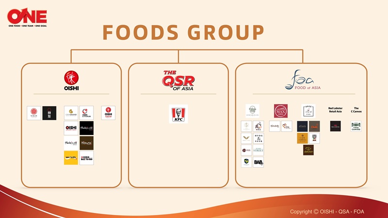 ปัจจุบันกลุ่มธุรกิจอาหารทั้ง 3 บริษัท รวม 28 แบรนด์ มีสาขารวมทั้งหมด 847 สาขา โดยที่กลุ่ม QSA มีสาขามากสุดที่ 500 สาขา กลุ่มโออิชิ 284 สาขา และกลุ่ม FOA 63 สาขา