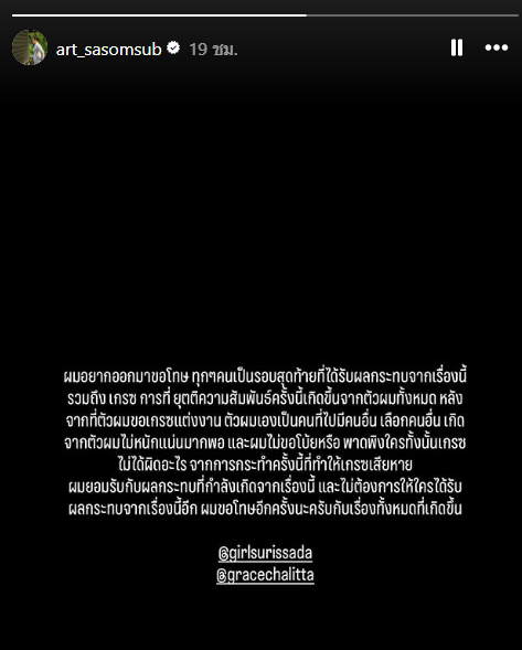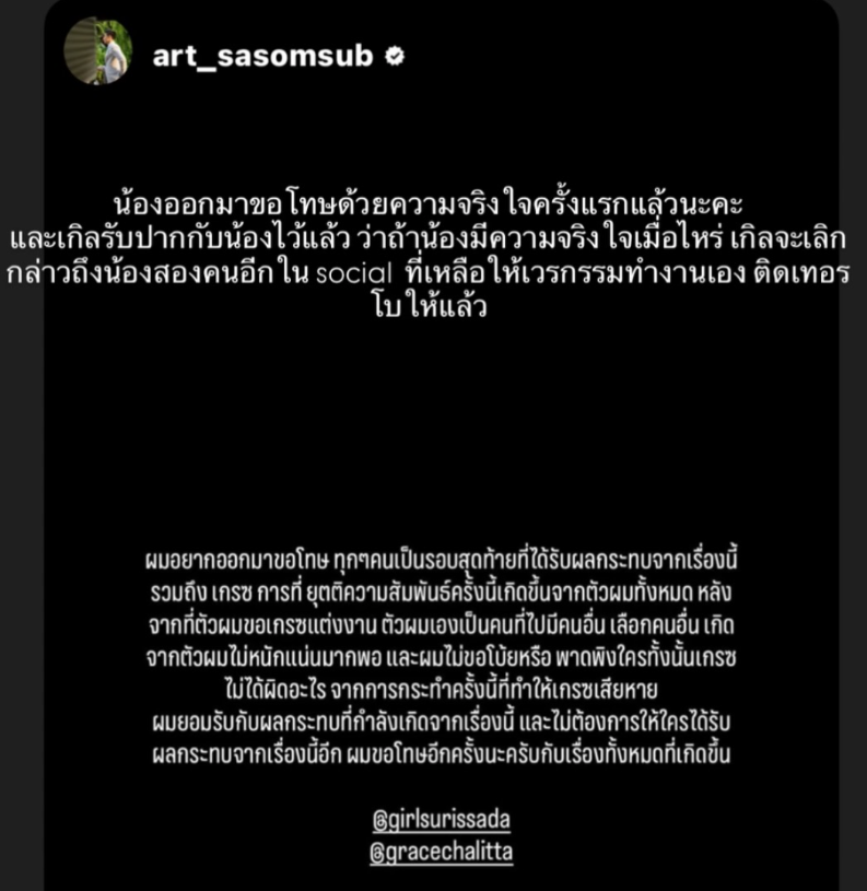 เกรซไม่ได้ผิดอะไร จากการกระทำครั้งนี้ที่ทำให้เกรซเสียหาย ผมยอมรับกับผลกระทบที่กำลังเกิดจากเรื่องนี้ และไม่ต้องการให้ใครได้รับผลกระทบจากเรื่องนี้อีก ผมขอโทษอีกครั้งนะครับกับเรื่องทั้งหมดที่เกิดขึ้น @girlsurissada @gracechalitta" พร้อมแท็กหา เกรซ กับ เกิล