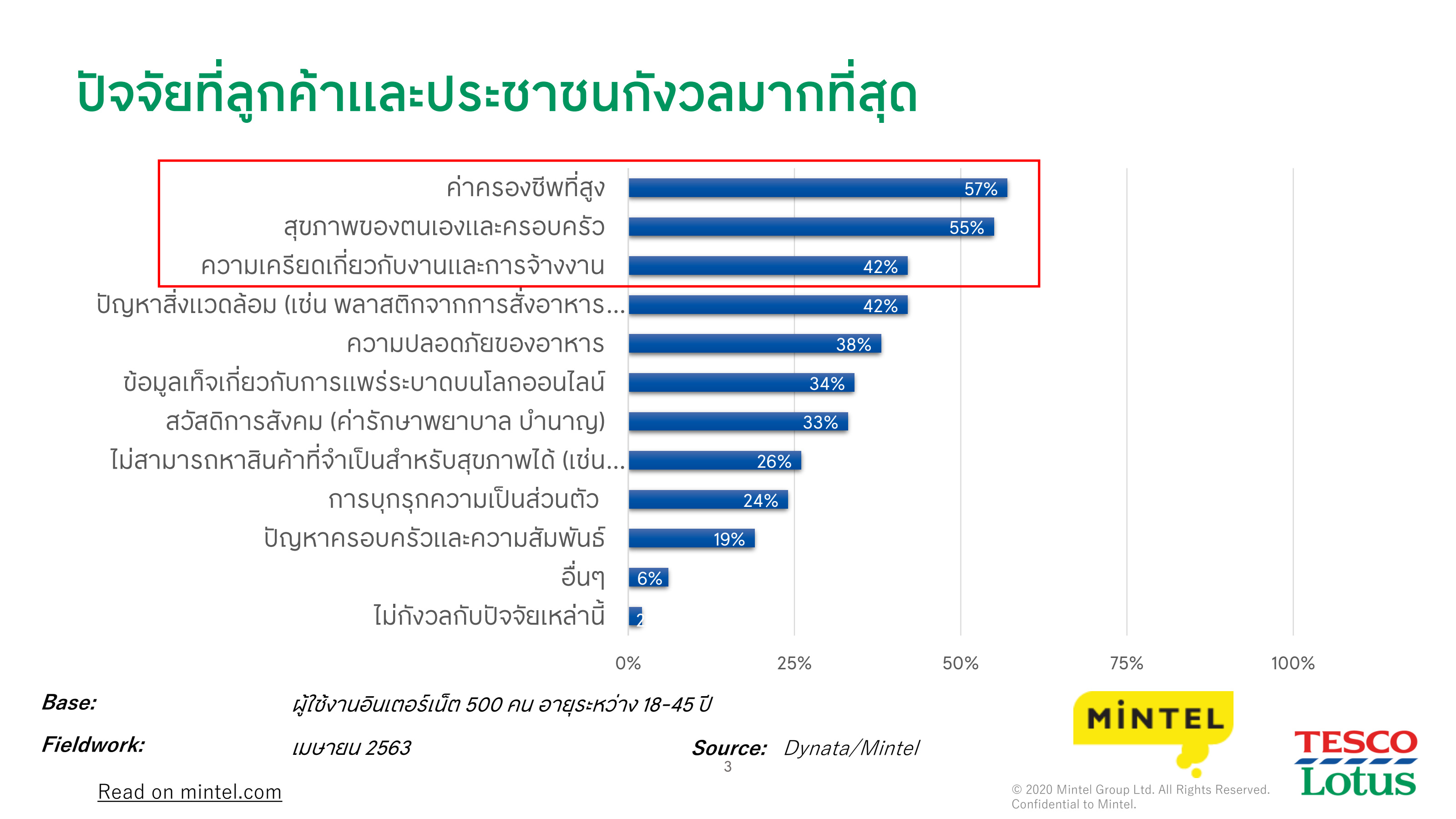 ซึ่งจากผลการสำรวจความกังวลของประชาชนโดย Mintel ในเดือนเมษายนที่ผ่านมา พบว่า 3 ปัจจัยหลักที่ประชาชนมีความกังวลมากที่สุด คือ กังวลเรื่องค่าครองชีพที่สูงถึง 57% กังวลในเรื่องสุขภาพถึง 55%  และกังวลในด้านความมั่นคงด้านอาชีพถึง 42% ซึ่งเป็นความกังวลสูงกว่าเรื่องสิ่งแวดล้อมที่เคยเป็นเรื่องกังวลสูงสุดในช่วงก่อนหน้านี้