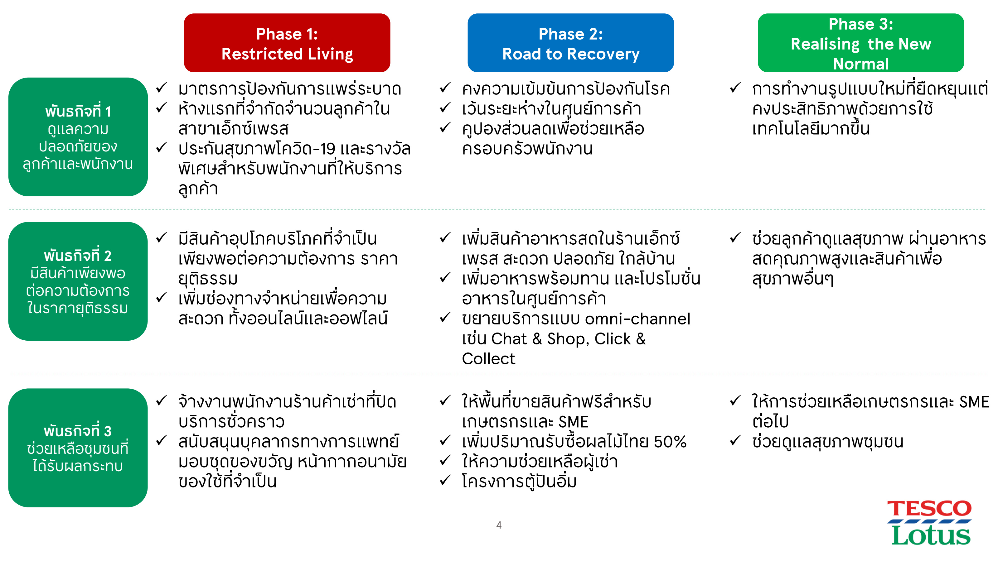 โดย นายสมพงษ์ รุ่งนิรัติศัย ประธานกรรมการบริหาร เทสโก้ โลตัส ชี้ว่า เทสโก้ โลตัสมุ่งมุ่งเน้นในพันธกิจ 3 ประการ ทั้งการดูแลสุขภาพและความปลอดภัยของลูกค้าและพนักงาน การจัดหาสินค้าที่จำเป็นและอาหารให้เพียงพอในราคายุติธรรม และการช่วยเหลือชุมชนที่ได้รับผลกระทบ เพื่อช่วยให้ทุกภาคส่วนสามารถก้าวไปข้างหน้าด้วยกัน