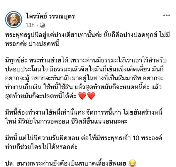 "พระพุทธรูปมีอยู่แค่ปางเดียวเท่านั้นค่ะ นั่นก็คือปางปลดทุกข์ ไม่มีหรอกค่ะ ปางปลดหนี้ มีทุกข์อ่ะ พระท่านช่วยได้ เพราะท่านมีธรรมะให้เราเอาไว้สำหรับปลอบประโลมใจ