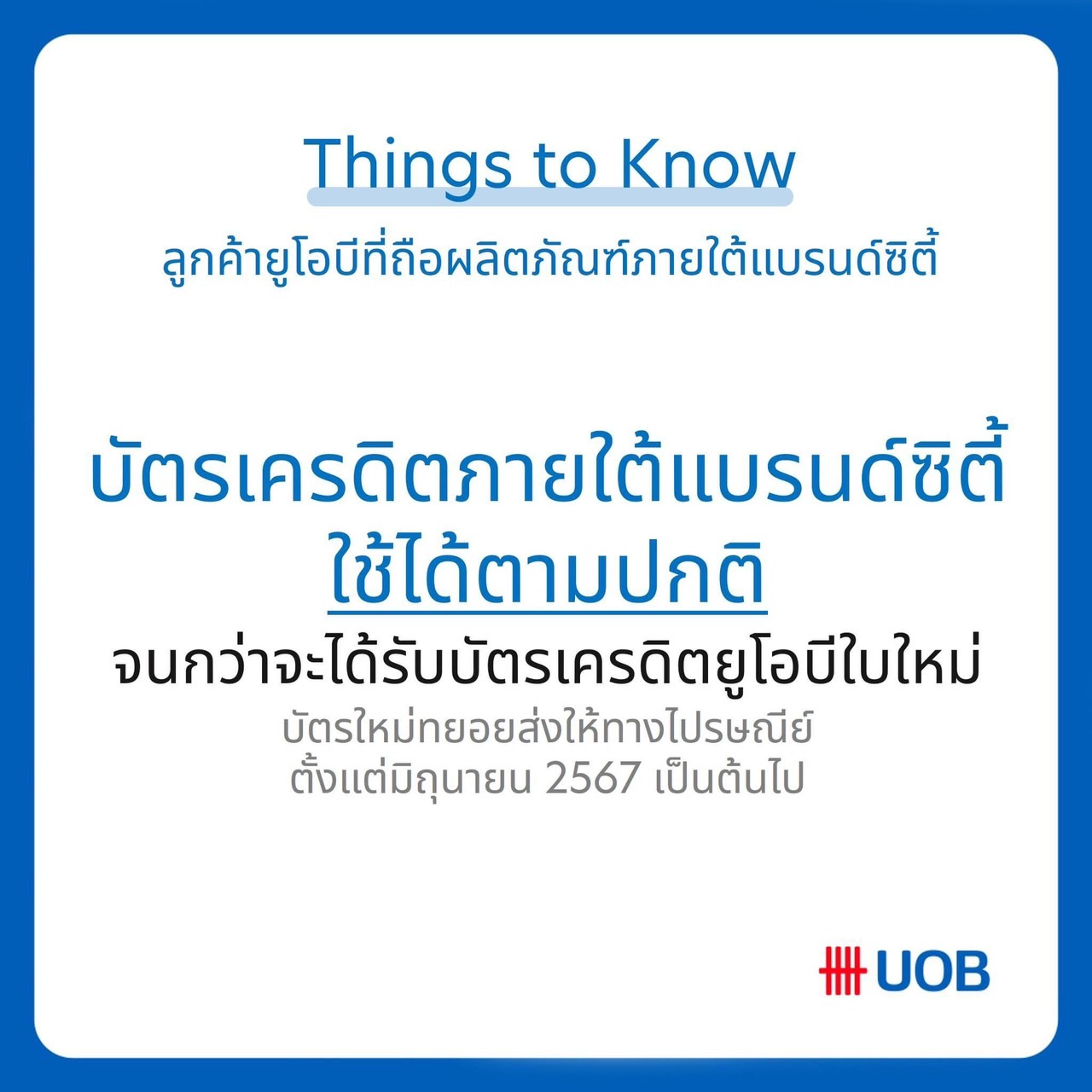 และสำหรับลูกค้าบัตรเครดิตภายใต้แบรนด์ซิตี้ ทางธนาคารจะทยอยจัดส่งบัตรเครดิตยูโอบีใบใหม่ให้ ตั้งแต่เดือนมิถุนายน-กรกฎาคม 2567 เป็นต้นไป ระหว่างนี้ลูกค้าสามารถใช้บัตรใบเดิมในการทำธุรกรรมต่าง ๆ ได้เช่นเดิม