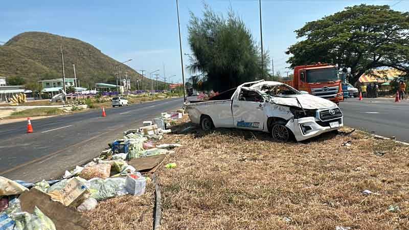 ถนนร้อนจัด กระบะขนผัก-แตงโม ยางบึ้มเทกระจาด2คันรวด รถหมุนฟาดเสาไฟ คนขับกระเด็นดับ การจราจรสุดโกลาหล ผู้การฯเมืองประจวบ เตือนขอให้เช็กสภาพรถและยางให้พร้อมอยู่เสมอก่อนออกเดินทาง