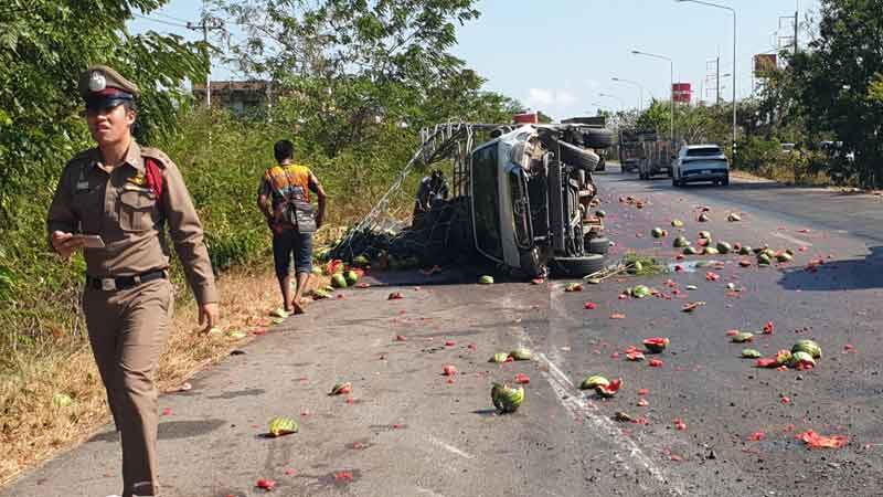 อ่านข่าวต้นฉบับได้ที่ : ถนนร้อนจัด กระบะขนผัก-แตงโม ยางบึ้มเทกระจาด2คันรวด รถหมุนฟาดเสาไฟ คนขับกระเด็นดับ