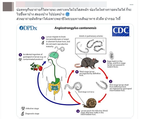 "ปอดหนูกินยาถ่ายก็ไม่หายนะ เพราะคนไม่ใช่โฮสหลัก น้องโตในร่างกายคนไม่ได้ ก็จะไชขึ้นตาบ้าง สมองบ้าง ไปปอดบ้าง