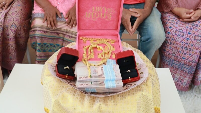 ซึ่งเงินค่าสินสอด จำนวน 1,000,000 บาท ทองคำ 30 บาท พร้อมแหวนเพชร จากนั้นเป็นการผูกข้อไม้ข้อมือ และพิธีรดน้ำสังข์