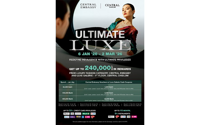 ตอบโจทย์นักช้อประดับพรีเมียมกับ “ULTIMATE LUXE 2026” จัดขึ้นระหว่างวันที่ 6 มกราคม – 2 มีนาคม 2569 มุ่งเจาะกลุ่มลูกค้า Luxury Fashion (ไม่รวม Luxury Watch & Jewelry) ที่มองหาความคุ้มค่า ควบคู่ประสบ การณ์การช้อประดับพรีเมียมที่เซ็นทรัล เอ็มบาสซี และ Luxe Galerie, เซ็นทรัล ชิดลม