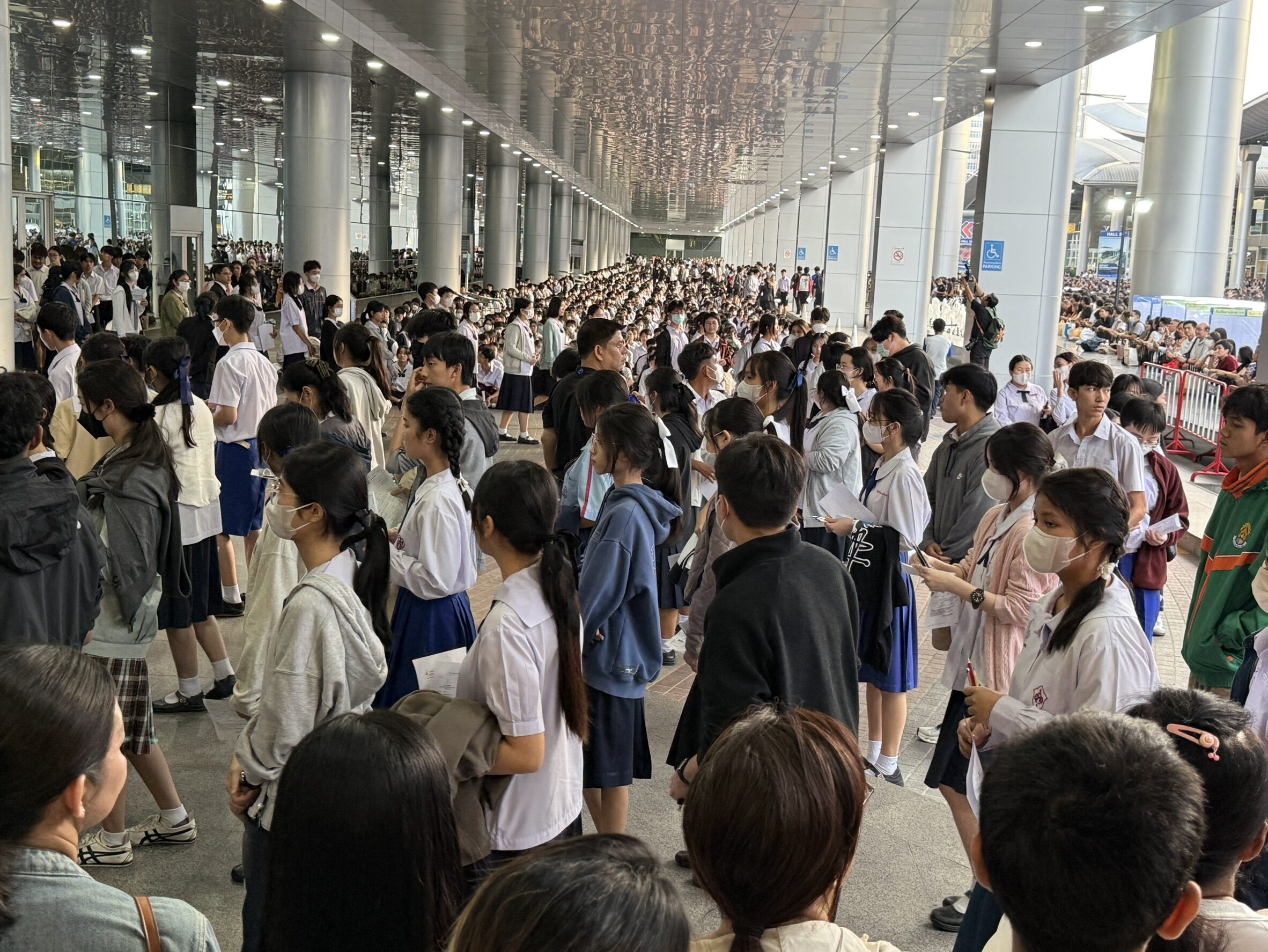 บรรยากาศเป็นไปอย่างคึกคักตั้งแต่ในช่วงเช้า มีกลุ่มผู้สมัครสอบนับพันคน มารอเตรียมตัวเพื่อเข้าห้องสอบ บริเวณด้านหน้าทางเข้าอาคารตั้งแต่เวลา 05.00 น. โดยผู้คุมการสอบจะอนุญาตให้ทยอยเข้าห้องสอบในเวลา 06.00 น. เป็นต้นไป