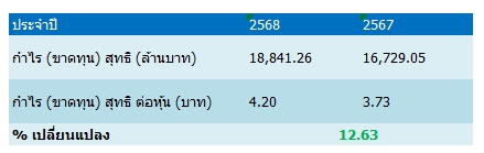 นอกจากนี้ที่ประชุมคณะกรรมการบริษัทมีมติอนุมัติการจ่ายเงินปันผลเป็นเงินสดให้แก่ผู้ถือหุ้นสามัญจากงวดดำเนินงานวันที่ 1 ม.ค. 2568 ถึงวันที่ 31 ธ.ค. 2568 โดยอัตราเงินปันผล 2.40 บาทต่อหุ้น