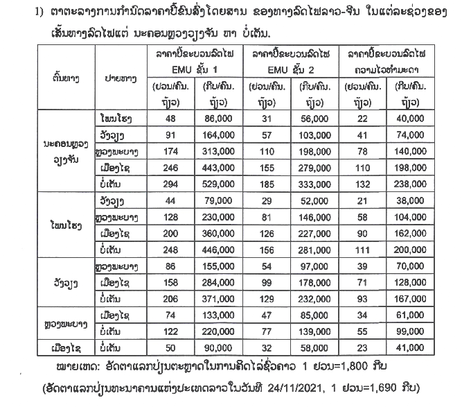 เคาะค่าตั๋วรถไฟลาว-จีน - เมื่อวันที่ 30 พ.ย. วิทยุสากลแห่งประเทศจีน รายงานว่าค่าตั๋วโดยสารรถไฟลาว-จีน ออกมาแล้ว รวมถึงค่าขนส่งสินค้า โดยคิดตามระยะทางตั้งแต่สถานีนครหลวงเวียงจันทน์ถึงสถานีบ่อเต็น รวมถึงชั้นที่นั่งและความเร็วรถไฟ ค่าตั๋วถูกสุดอยู่ที่ 38,000 กีบ (1 บาทเท่ากับ 311 กีบ อัตราแลกเปลี่ยน ณ วันที่ 30 พ.ย.2564) ประมาณ 118 บาท และแพงสุด 529,000 กีบ (1,645 บาท)