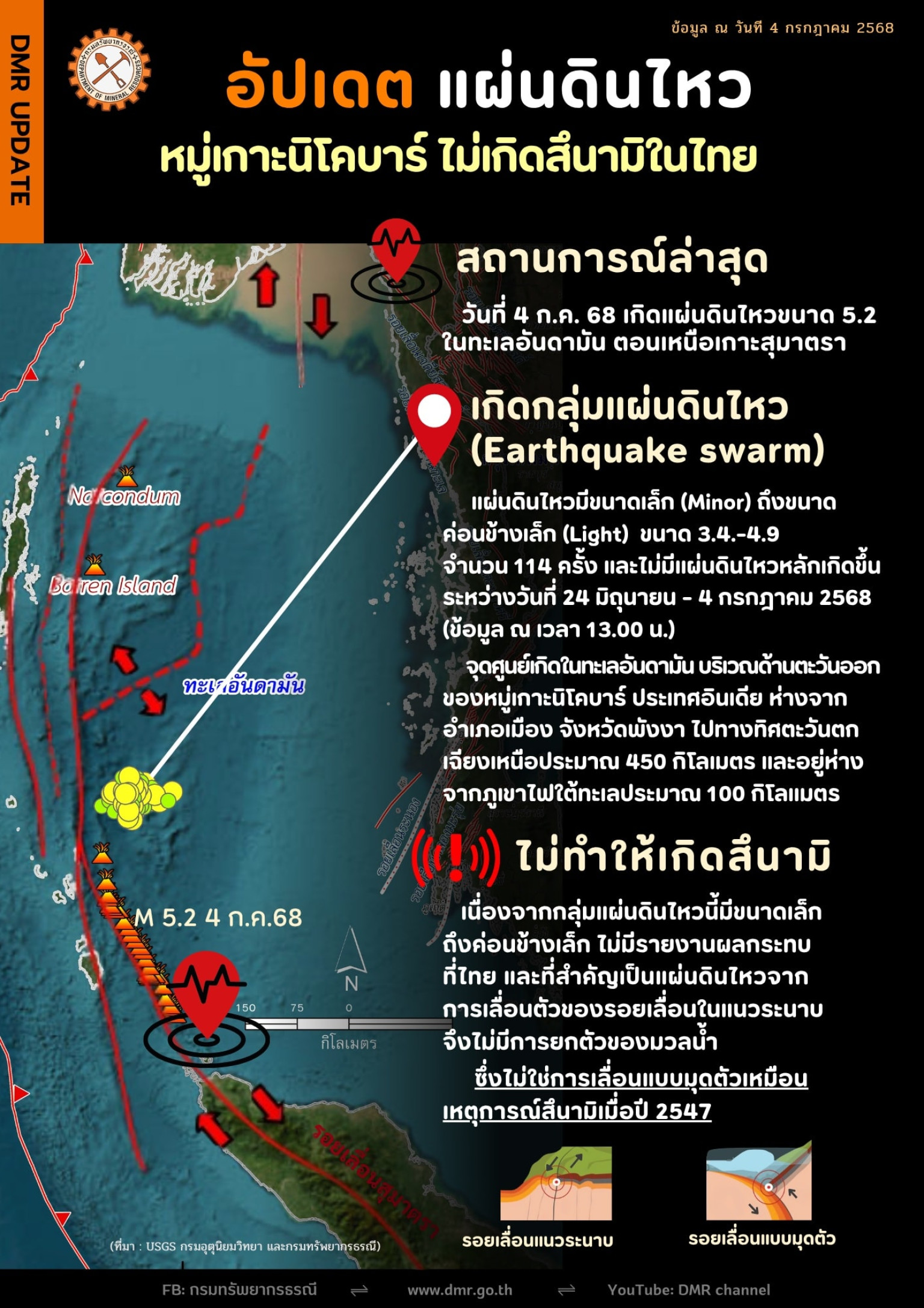 วันที่ 4 ก.ค.68 เพจ กรมทรัพยากรธรณี โพสต์ข้อความระบุว่า อัปเดตเหตุการณ์แผ่นดินไหวหมู่เกาะนิโคบาร์ ประเทศอินเดีย ไม่เกิดสึนามิในไทย