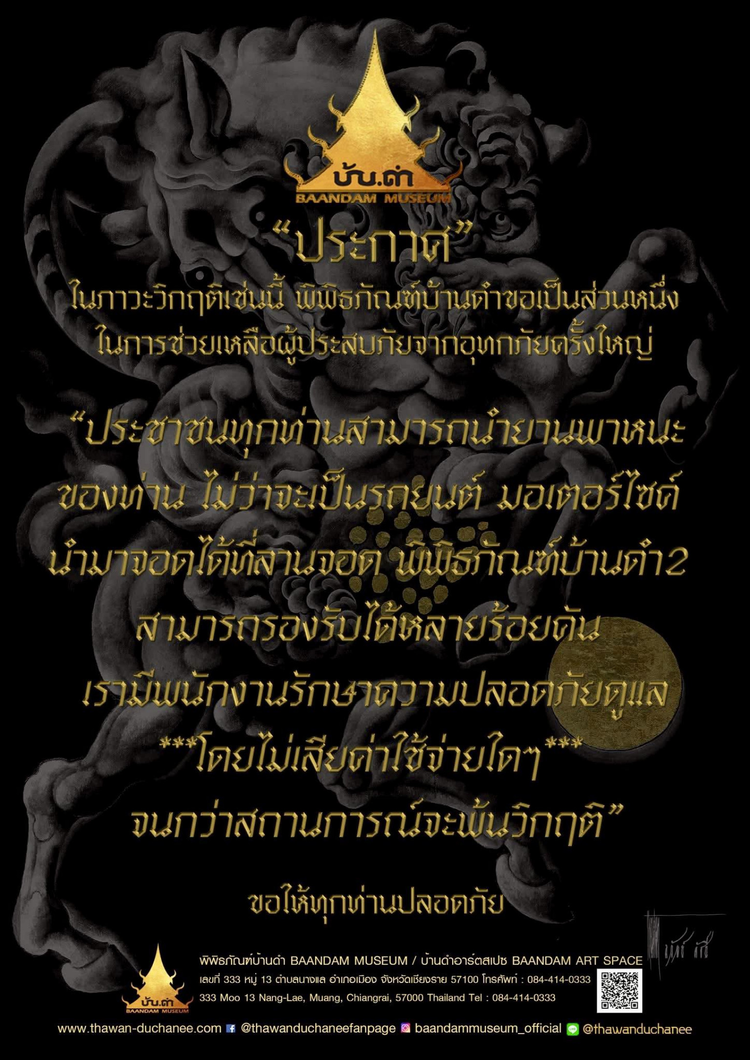 วันที่ 23 ก.ค.68 ดร.ดอยธิเบศร์ ดัชนี ลูกชายของอาจารย์ถวัลย์ ดัชนี ศิลปินแห่งชาติ สาขาทัศนศิลป์ พ.ศ. 2544 โพสต์ประกาศผ่านเฟซบุ๊ก Doytibet Duchanee ระบุข้อความว่า ประกาศ!!! ในภาวะวิกฤติเช่นนี้ พิพิธภัณฑ์บ้านดำขอเป็นส่วนหนึ่งในการช่วยเหลือผู้ประสบภัยจากอุทกภัย