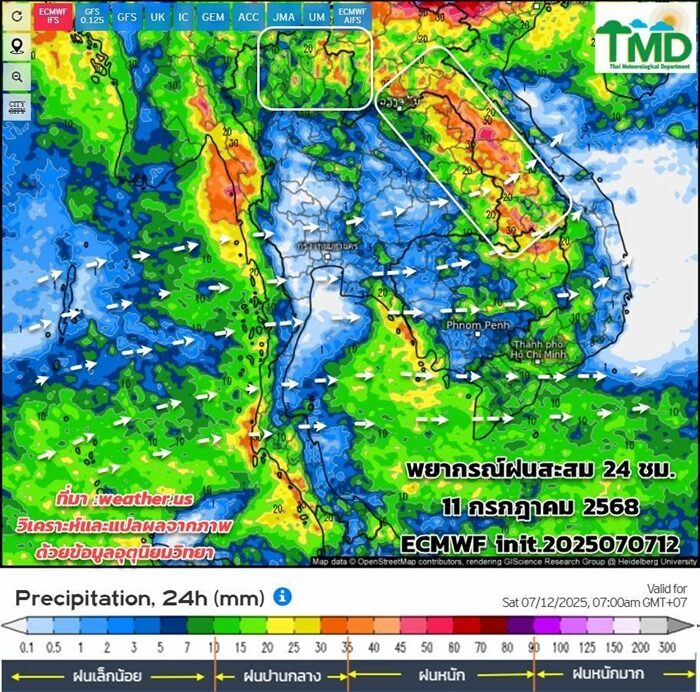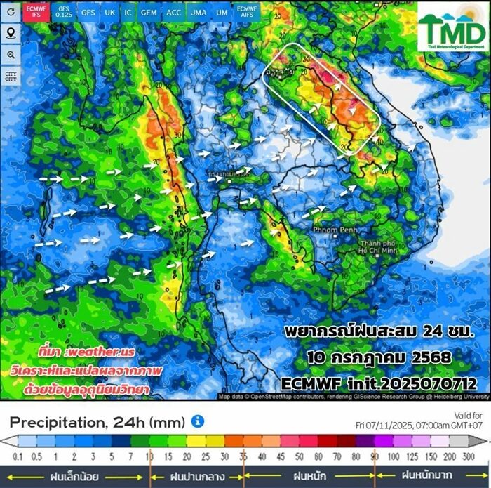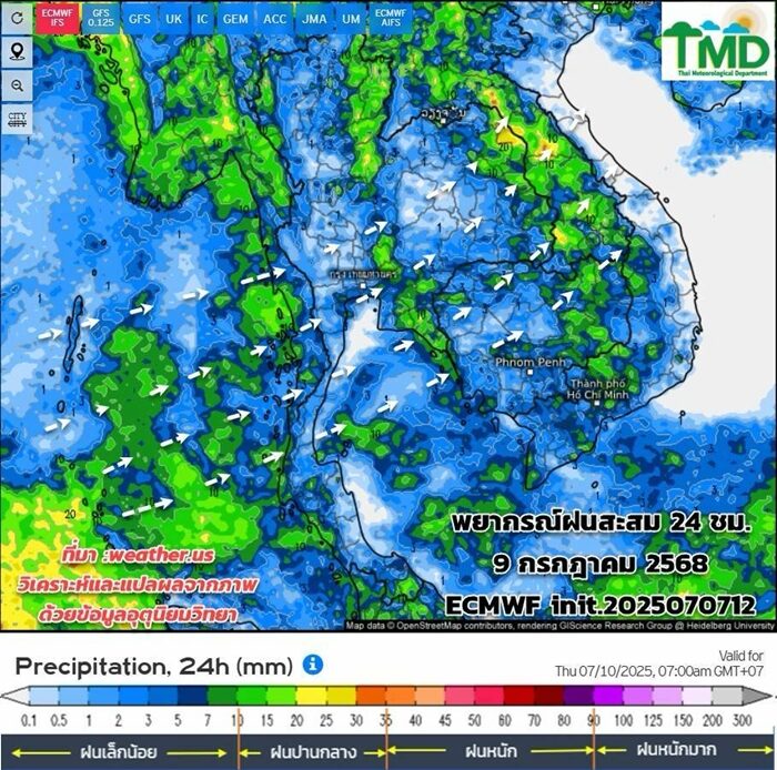 วันที่ 8 ก.ค.2568 กรมอุตุนิยมวิทยา อัปเดตผลการพยากรณ์ฝนสะสมรายวัน (ทุกๆ 24 ชม.:(นับตั้งแต่เวลา 07.00 น. ถึงเวลา 07.00 น.วันรุ่งขึ้น) และลมที่ระดับ 925hPa (750 ม.)14 วันล่วงหน้า ระหว่าง 8-21 ก.ค.68 init. 2025070712 จากศูนย์พยากรณ์อากาศระยะกลางยุโรป (ECMWF) วิเคราะห์ตามผลจากแบบจำลองฯ เฉดสีแดงหมายถึงฝนหนัก สีเขียวหมายถึงฝนเล็กน้อย :