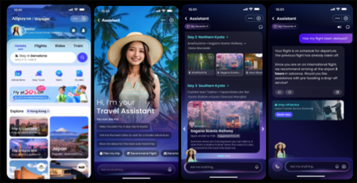 ด้วยอินเตอร์เฟส AI ที่รวมอยู่ในกระเป๋าเงินดิจิทัลและซูเปอร์แอป Alipay+ Voyager ช่วยให้นักท่องเที่ยวสามารถใช้งานผ่านการพิมพ์หรือสั่งงานด้วยเสียงในภาษาของตนเอง เพื่อวางแผนการเดินทาง จองบริการต่างๆ และเลือกซื้อสินค้าหรือบริการจากร้านค้าในประเทศที่ไปเยือนได้อย่างครบวงจรและไม่มีสะดุด