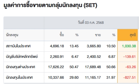 โดยวันนี้ (3 ก.ค.68) ดัชนีตลาดหุ้นไทยปิดที่ 1,127.21 จุด เพิ่มขึ้น 11.52 จุด (+1.03%) มูลค่าซื้อขาย 34,920.97 ล้านบาท