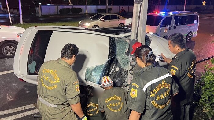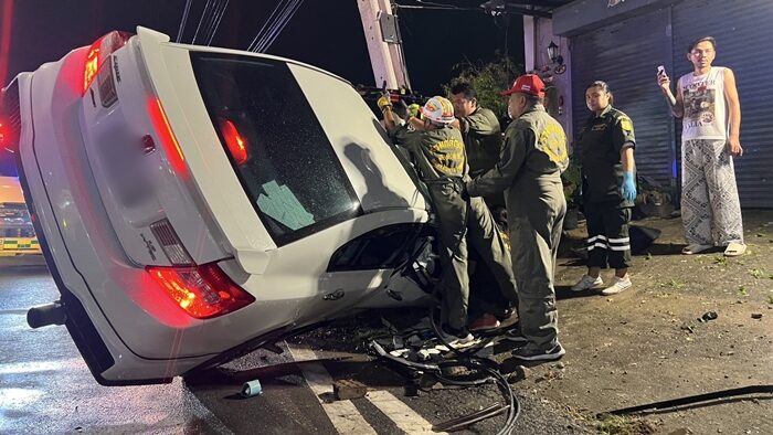 อีก 1 กิโลเมตรจะถึงบ้าน เก๋งแหกโค้ง เสียหลักพุ่งฟาดเสาไฟฟ้าเต็มแรง พลิกตะแคงข้างติดคาเสา บาดเจ็บสาหัส เจ้าหน้าที่เร่งงัดซากรถช่วยชีวิต