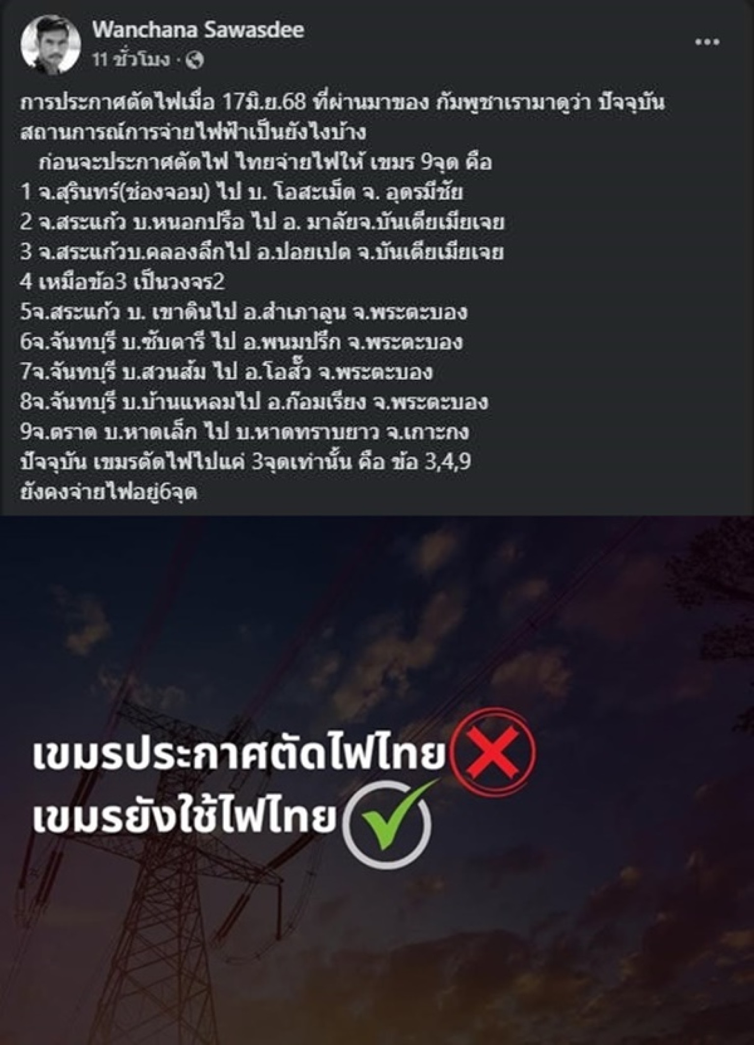 การประกาศตัดไฟเมื่อ 17มิ.ย.68 ที่ผ่านมาของ กัมพูชาเรามาดูว่า ปัจจุบันสถานการณ์การจ่ายไฟฟ้าเป็นยังไงบ้าง