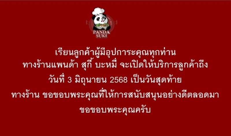 "เรียนลูกค้าผู้มีอุปการคุณทุกท่าน ทางร้านแพนด้า สุกี้ บะหมี่ จะเปิดให้บริการลูกค้าถึง วันที่ 3 มิถุนายน 2568 เป็นวันสุดท้าย ทางร้าน ขอขอบพระคุณที่ให้การสนับสนุนอย่างดีตลอดมา ขอขอบพระคุณครับ"