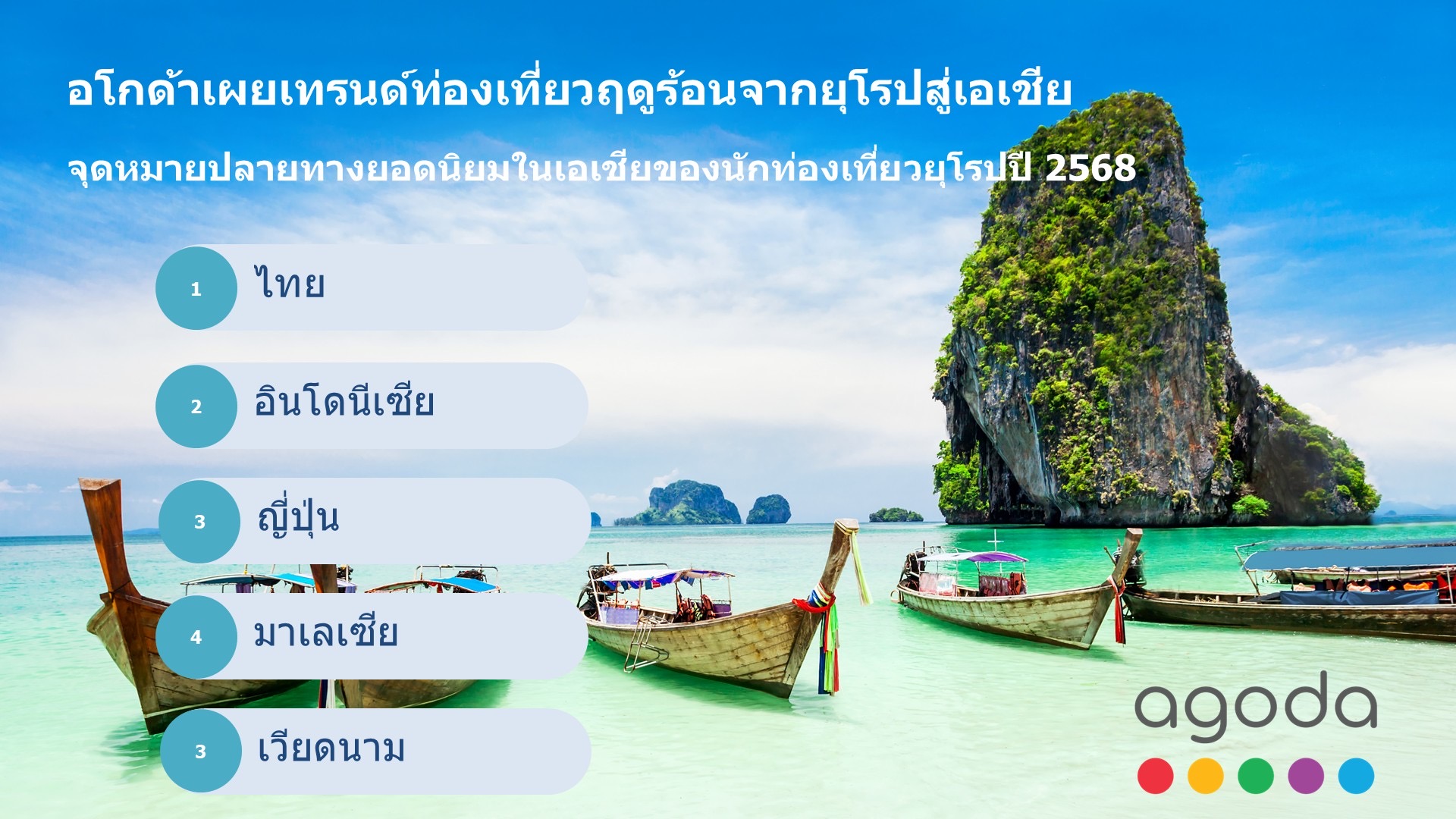 agoda (อโกด้า) รายงานเทรนด์การค้นหาที่พักในเอเชีย สำหรับวันหยุดฤดูร้อนของชาวยุโรป ปี 2025 พบว่า 5 อันดับแรกจุดหมายปลายทางยอดนิยม ได้แก่