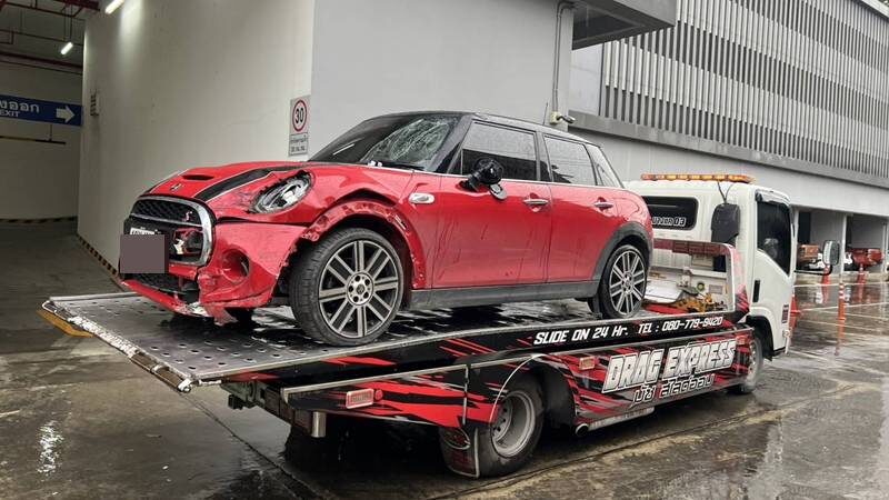 มินิคูเปอร์แดง ลงสะพานพุ่งชนจยย. ดับ1 สาหัส1 หนีเข้าคอนโด ยังไม่เจอคนขับ