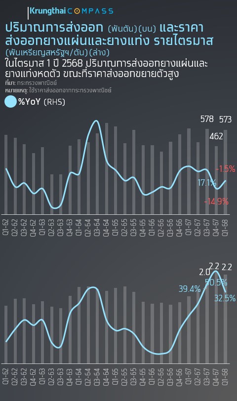 มูลค่าการส่งออกยางแผ่นและยางแท่งไตรมาสที่ 1 ปี 2568 ขยายตัว 30.6%YoY จากราคาส่งออกที่ปรับตัวเพิ่มขึ้นถึง 32.5%YoY แต่ปริมาณการส่งออกหดตัว -1.5%YoY จากปริมาณการส่งออกยางแผ่นและยางแท่งไปสหรัฐฯ ซึ่งคิดเป็นสัดส่วน 12% ของการส่งออกยางแผ่นและยางแท่งทั้งหมดของไทยหดตัว -13.5%YoY ส่วนหนึ่งจากฐานที่สูงในปีก่อน ขณะที่ปริมาณการส่งออกยางแผ่นและยางแท่งไปจีนขยายตัว 24.6%YoY จากการเร่งนำเข้ายางแผ่นและยางแท่งเพื่อเป็นวัตถุดิบในการผลิตยางล้อและชิ้นส่วนรถยนต์ไปสหรัฐฯ