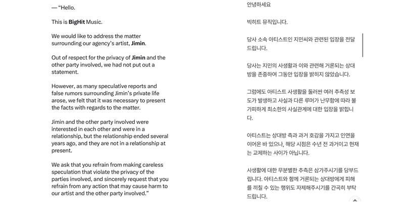 ล่าสุด BIGHIT MUSIC ต้นสังกัดของจีมิน ได้ออกแถลงการณ์อย่างเป็นทางการ เมื่อวันที่ 31 ส.ค.ที่ผ่านมา โดยระบุว่า “ในช่วงที่ผ่านมา บริษัทมิได้ออกแถลงการณ์ใดๆ เนื่องจากให้ความเคารพชีวิตส่วนตัวของ Jimin (BTS) และบุคคลที่ถูกกล่าวถึงเกี่ยวกับกรณีที่ปรากฏในข่าว