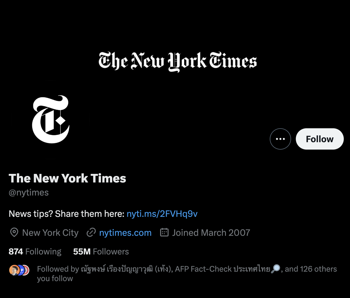 บัญชี Twitter ของ The New York Times ไม่มีเครื่องหมายติ๊กถูกสีฟ้า แม้จะมีผู้ติดตามถึง 55 ล้านคน[/caption]