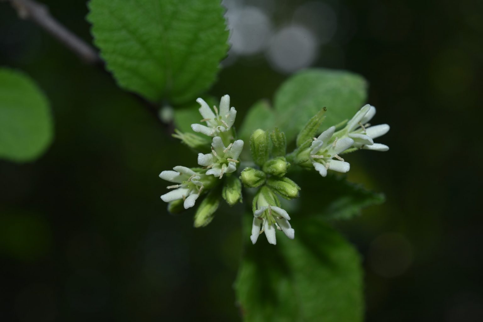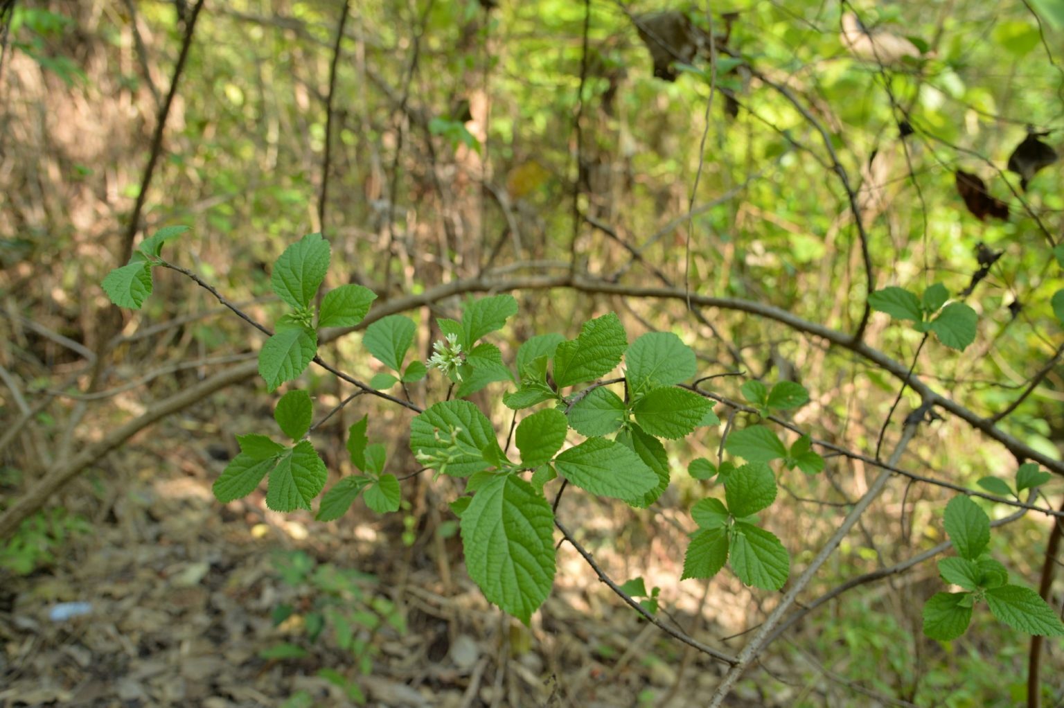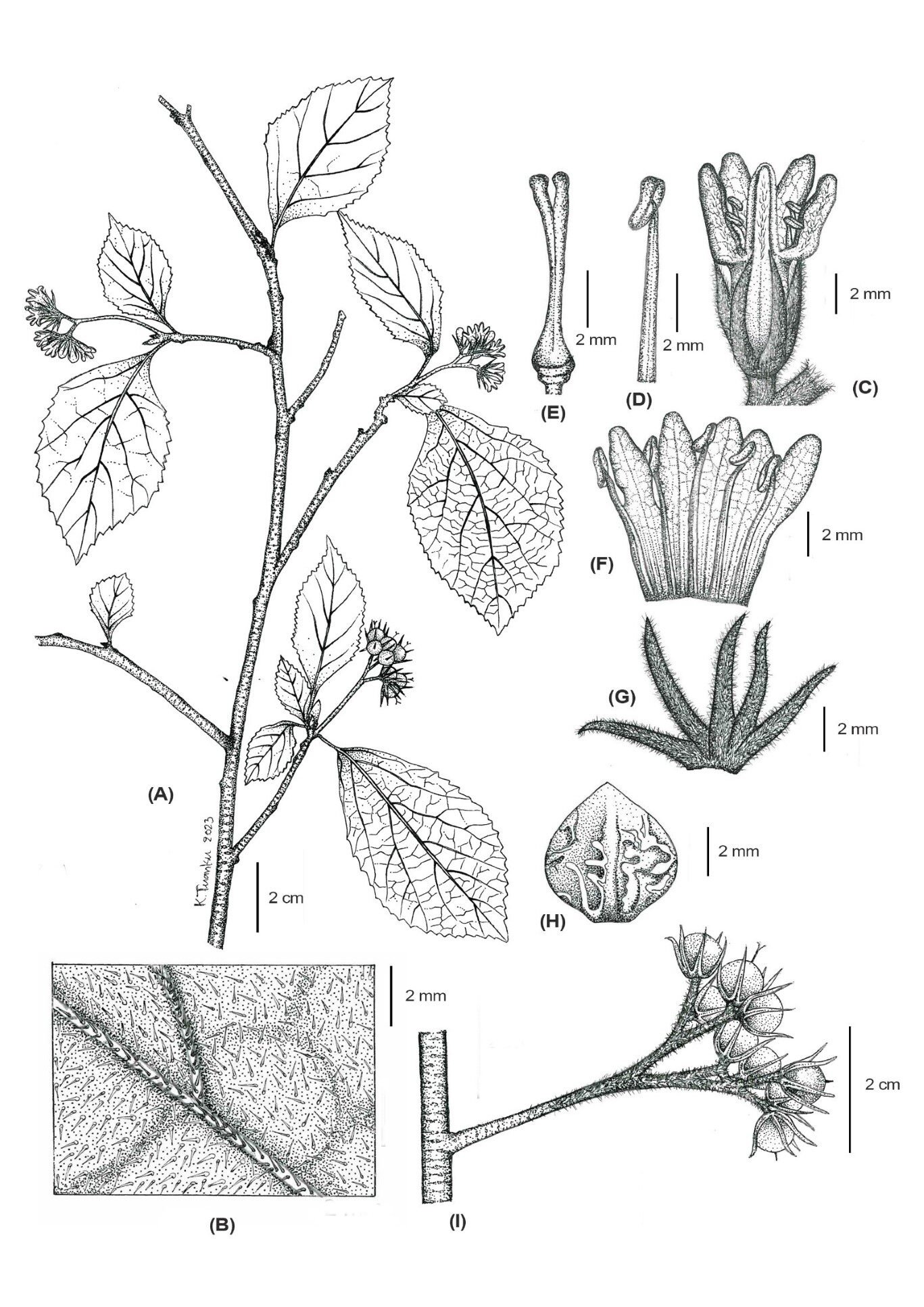 ลักษณะทางพฤกษศาสตร์ ไม้พุ่มกึ่งพาดเลื้อย สูงได้ถึง 2 เมตร ใบเดี่ยว เรียงเวียน รูปรี กว้าง 2.5-8 ซม. ยาว 4-13 ซม. ปลายแหลม โคนรูปลิ่ม อาจเบี้ยวเล็กน้อย ขอบจักฟันเลื่อยถึงหยักซึ่ฟันไม่เป็นระเบียบ แผ่นใบบางคล้ายกระดาษ มีขนทั้ง 2 ด้าน เส้นแขนงใบข้างละ 3-7 เส้น ด้านบนนูนเล็กน้อย ด้านล่างนูนเด่นชัด ก้านใบยาว 0.5-2.5 ซม. มีขนสีขาวหนาแน่น ช่อดอกแบบช่อเชิงหลั่น ออกที่ปลายยอดหรือบนกิ่งสั้นใกล้ปลายยอด ช่อยาว 2.5-6 ซม. แต่ละช่อมี 4-10 ดอก ก้านช่อดอกยาว 1.5-3.5 ซม. มีขนหนาแน่น