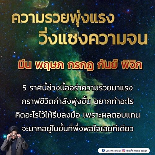 หมอเค้ก Magic stone เผย ดวงชะตา 5 ราศี ความรวยพุ่งแรง วิ่งแซงความจน กราฟชีวิตกำลังพุ่งขึ้น อยากทำอะไรคิดอะไรไว้ให้รีบลงมือ ประกอบด้วย ราศีมีน ราศีพฤษภ ราศีกรกฎ ราศีกันย์ และ ราศีพิจิก