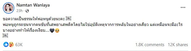 เป็นเรื่องเศร้าที่ไม่มีใครอยากให้เกิดขึ้น เมื่อ น้ำตาล อินฟลูเอนเซอร์ชื่อดัง โพสต์ข้อความร้องขอความเป็นธรรม ผ่านทางเฟซบุ๊ก Namtan Wanlaya หลังพ่อของน้องต้องจากไปอย่างกะทันหันจากอุบัติเหตุ ความว่า ขอความเป็นธรรมให้พ่อหนูด้วยนะคะ พ่อหนูถูกรถชนจากคนขับที่เสพยาเสพติดโดยไม่ใช่อุบัติเหตุจากการหลับในอย่างเดียว แต่เหมือนมีอะไรบางอย่างทำให้เรื่องเงียบ