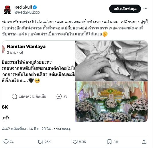 ด้านRed Skull ให้ข้อมูลเคสนี้ ระบุว่า พ่อเขาขับรถพ่วง10 ล้อแล้วยางแตกเลยจอดลงชิดข้างทางแล้วลงมาเปลี่ยนยาง จู่ๆก็มีรถพ่วงอีกคันพุ่งมาชนทั้งที่รถจอดเปลี่ยนยางอยู่ ตำรวจตรวจเจอสารเสพติดคนที่ขับมาชน แต่ ตร.แจ้งแค่ว่าเป็นการหลับใน แบบนี้ก็ได้เหรอ