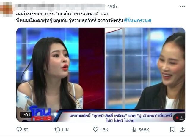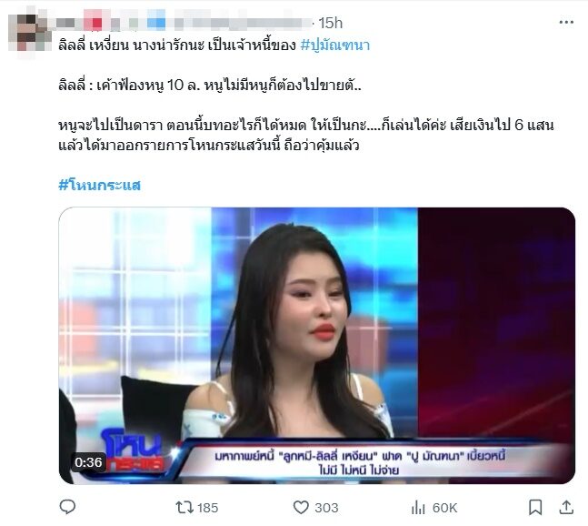 ล่าสุดไปออกรายการ โหนกระแส ลิลลี่ ขึ้นแท่นตัวตึงถูกพูดถึงในโซเชียลอย่างมาก เมื่อประกาศถึง ปู ว่า เงิน 6 แสน ยกให้พร้อมทั้งเล่าเรื่องราวที่ไปรู้จัก ปู ด้วยว่า