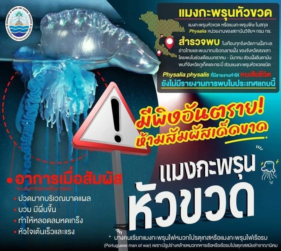 วันที่ 25 มิ.ย.2567 กรมทรัพยากรทางทะเลและชายฝั่ง (ทช.) กระทรวงทรัพยากรธรรมชาติและสิ่งแวดล้อม (ทส.) แจ้งเตือนพบ แมงกระพรุนหัวขวด (Physalia sp.) บริเวณอ่าวหลา อ่าวทือ เกาะราชาใหญ่ จ.ภูเก็ต ขอให้นักท่องเที่ยว และผู้ทำกิจกรรมทางทะเลในบริเวณดังกล่าวระมัดระวัง