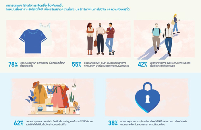 คนกรุงเทพฯ กว่า 4 ใน 5 หรือ 82% ที่ร่วมตอบแบบสอบถามระบุว่าพวกเขามักกังวลเมื่อรู้สึกเหนียวตัวและอึดอัดกับเสื้อผ้าที่สวมใส่อยู่ ราว 80% ระบุว่าพวกเขาเผชิญผลกระทบเชิงลบที่เกี่ยวกับความร้อนในปัจจุบันมากกว่าที่เคยเป็น (เช่น ปวดหัว อ่อนเพลีย มีอาการชา หรือนอนได้ไม่ต่อเนื่อง) ยิ่งไปกว่านั้น ผู้คนราว 50% เผยว่าพวกเขาจะหงุด หงิดอารมณ์ไม่ดีถ้าร้อนจนเหงื่อตกระหว่างเดินทาง ปัญหาไม่ได้จำกัดอยู่แค่ช่วงระหว่างเดินทางเท่านั้นด้วย เพราะพอไปถึงที่ทำงานแล้ว เสื้อผ้าก็มักส่งผลต่อประสิทธิภาพในการทำงาน คนกรุงเทพฯ ราว 42% ยอมรับว่าเวลาอึดอัดกับเสื้อผ้าที่สวมใส่ คุณภาพงานของพวกเขาจะลดลง