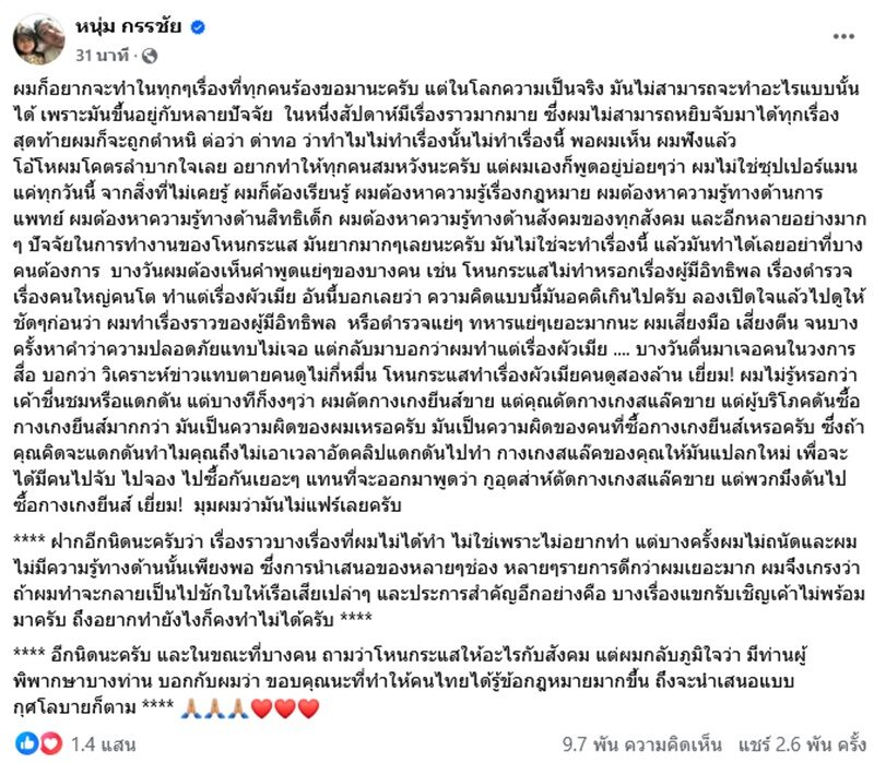 พิธีกรดังถึงกับโพสต์ยาวเลย หนุ่ม กรรชัย ไปเจออะไรมาทำเอาเจ้าตัวถึงกับโพสต์ลงโซเชียลร่ายยาวชี้แจงเรื่องการทำรายการโหนกระแสที่พยายามทำอย่างดีที่สุดแล้ว แต่ก็มีบางคนที่ยังไม่พอใจ หรือมีเสียงจากคนในวงการสื่อที่มาแดกดันด้วยว่า