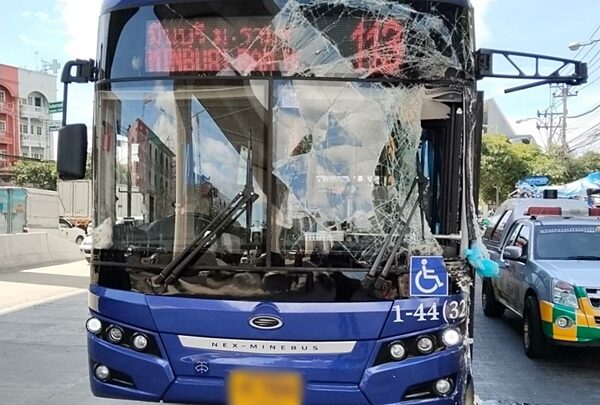สองแถว ซิ่งปาดหน้ารถเมล์ สาย113 ก่อนถูกเสยท้ายพังยับเยิน ผู้โดยสารบาดเจ็บนับสิบราย บนถนนย่านมีนบุรี ด้าน ตำรวจ เร่งตรวจสอบกล้องวงจรปิด