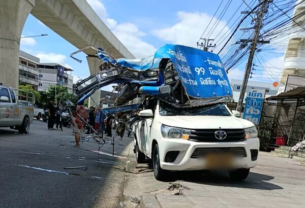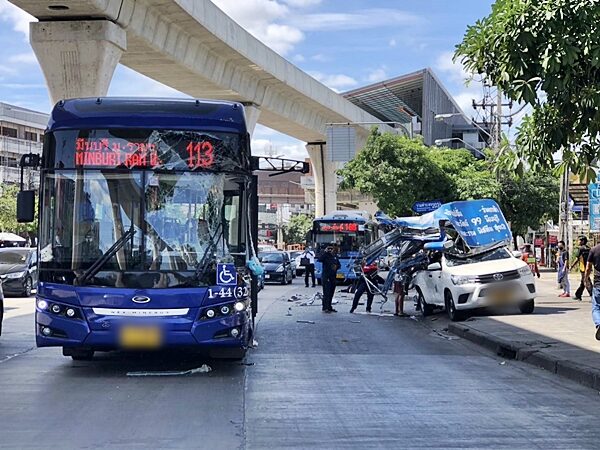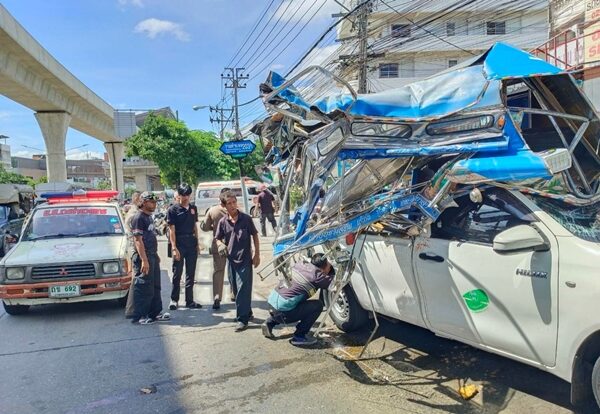 สองแถว ซิ่งปาดหน้ารถเมล์ ก่อนถูกเสยท้ายพังยับ ผู้โดยสารเจ็บนับสิบราย