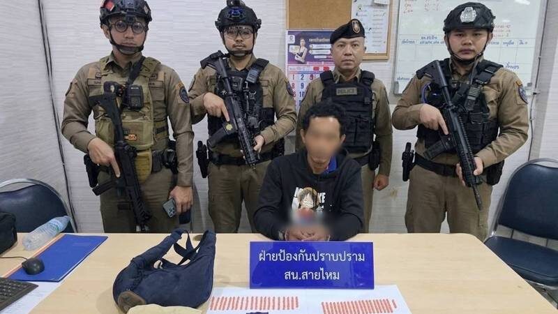 สายตรวจ สน.สายไหม พบหนุ่มพักยาบ้า 394 เม็ด เห็นตำรวจโยนกระเป๋าใส่ยาบ้าของกลางทิ้งลงบนพื้นถนน สุดท้ายหนีไม่รอด