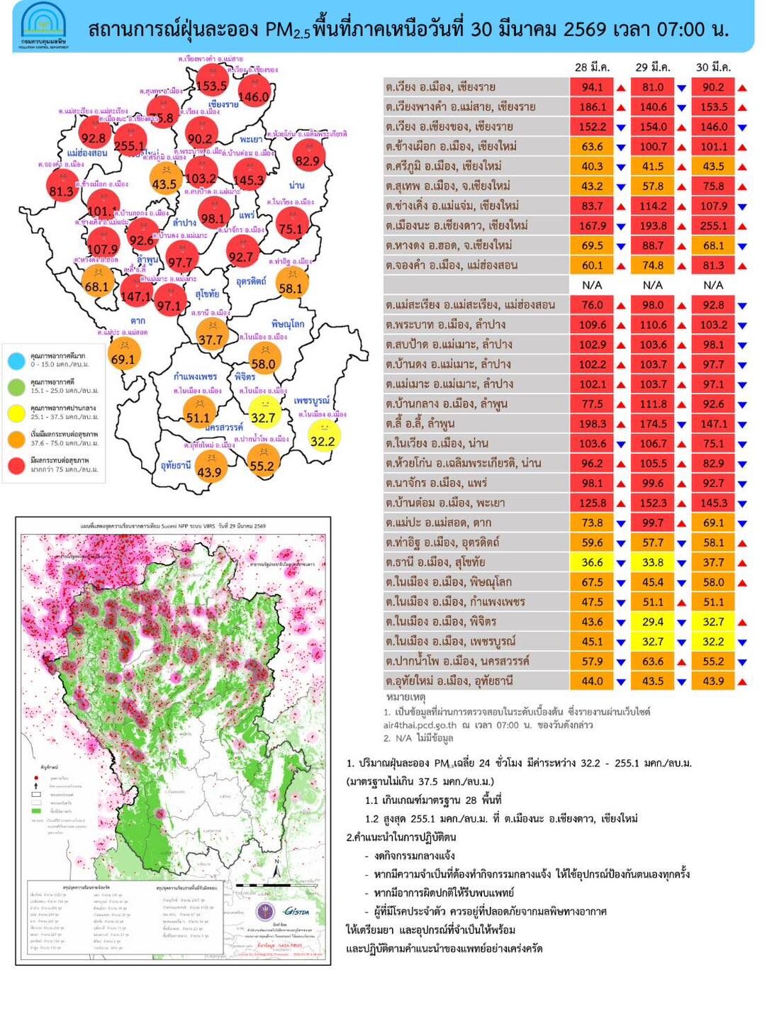 วันที่ 30 มี.ค.2569 ศูนย์สื่อสารการแก้ไขปัญหามลพิษทางอากาศ รายงานการติดตามตรวจสอบคุณภาพอากาศ ประจำวันที่ 30 มีนาคม 2569 ณ 07:00 น สรุปดังนี้