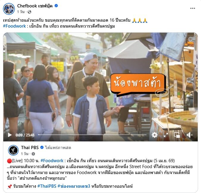 เป็นอีกหนึ่งรายการที่ประกาศอำลาจอ เชฟบุ๊ค โพสต์ประกาศอำลา รายการ Foodwork รายการทำอาหารดัง ออกอากาศเทปสุดท้ายทางช่อง ไทยพีบีเอส ในวันที่ 5 เม.ย.69 ที่ผ่านมา ซึ่ง เชฟบุ๊ค พร้อมด้วยน้องพาสต้าลูกชาย ดำเนินรายการ ก่อนอำลากับเทปรายการเทปที่ 666 พร้อมระบุข้อความว่า ลาก่อน แคปชั่นด้วยว่า